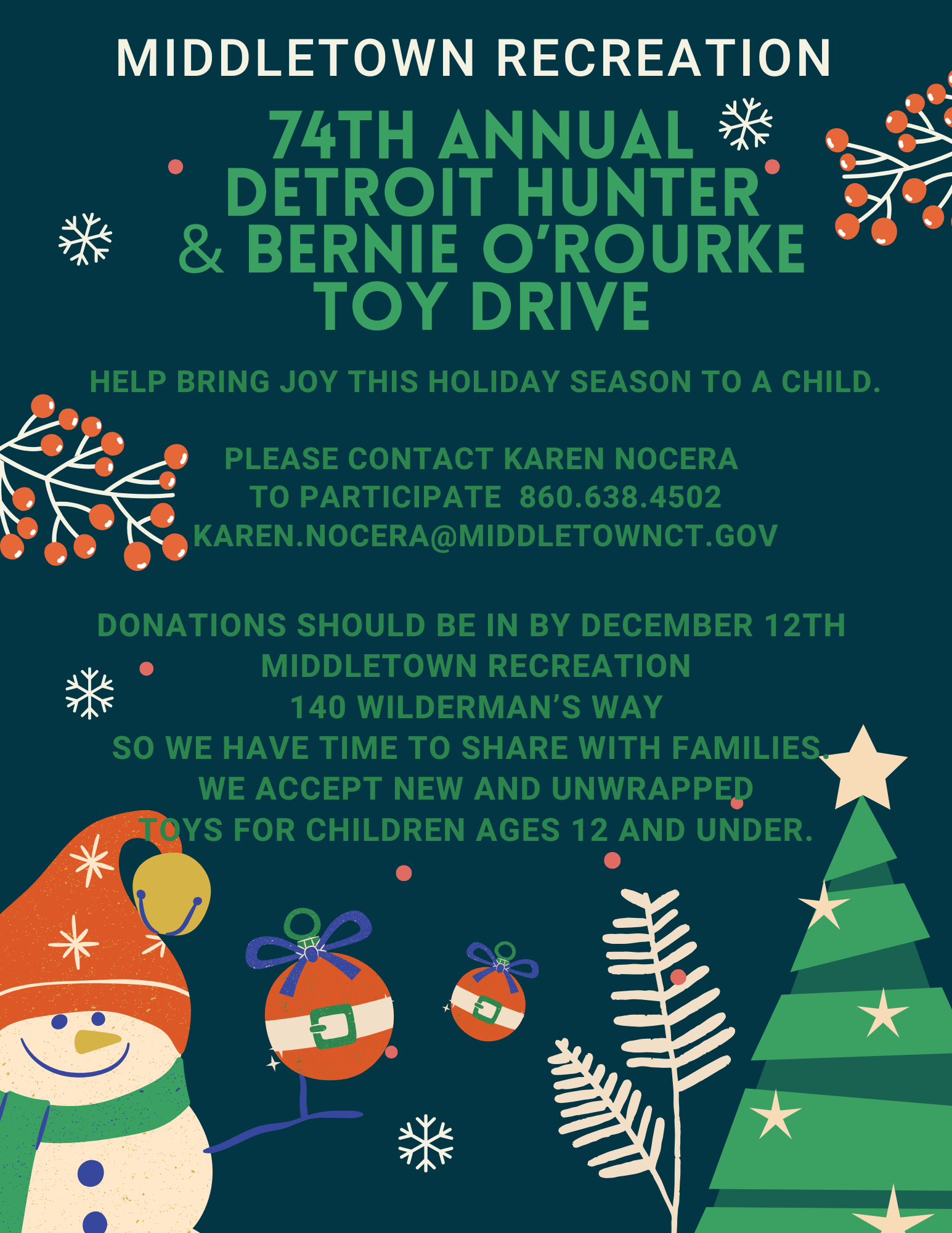 On Saturday 12/6, 10:00-12:00 PM, in the parking lot of the Middletown Rec Center, 140 Wilderman's Way, Middletown, MYL will be collecting toys for the 74th Annual Detroit Hunter & Bernie O’Rourke Middletown Recreation Toy Drive.